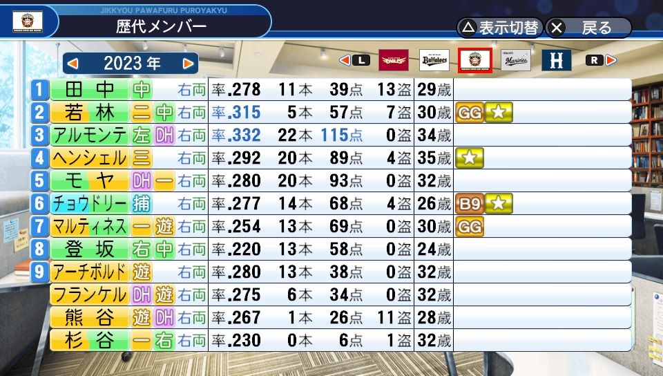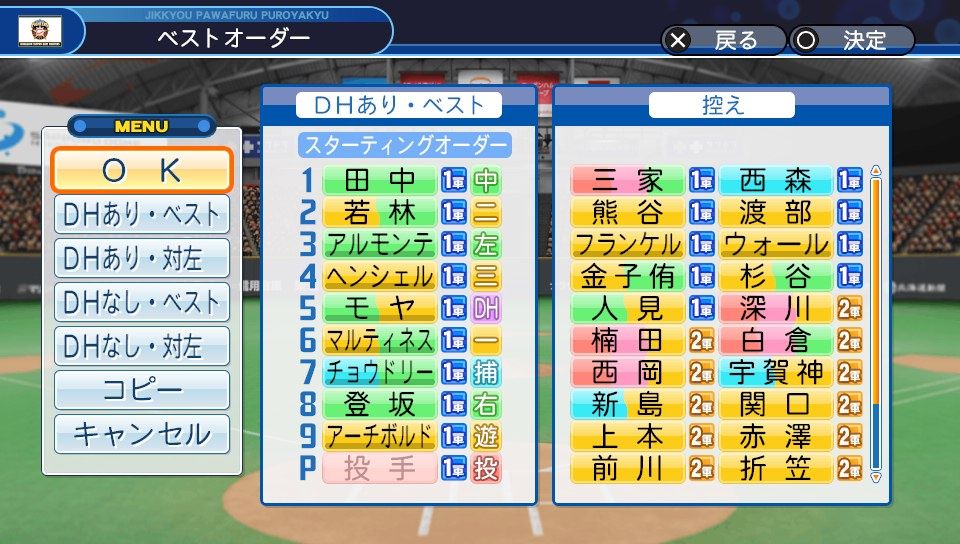 田中に変えてモヤが外野の守備についてフランケルがDHで出場(対右限定)
